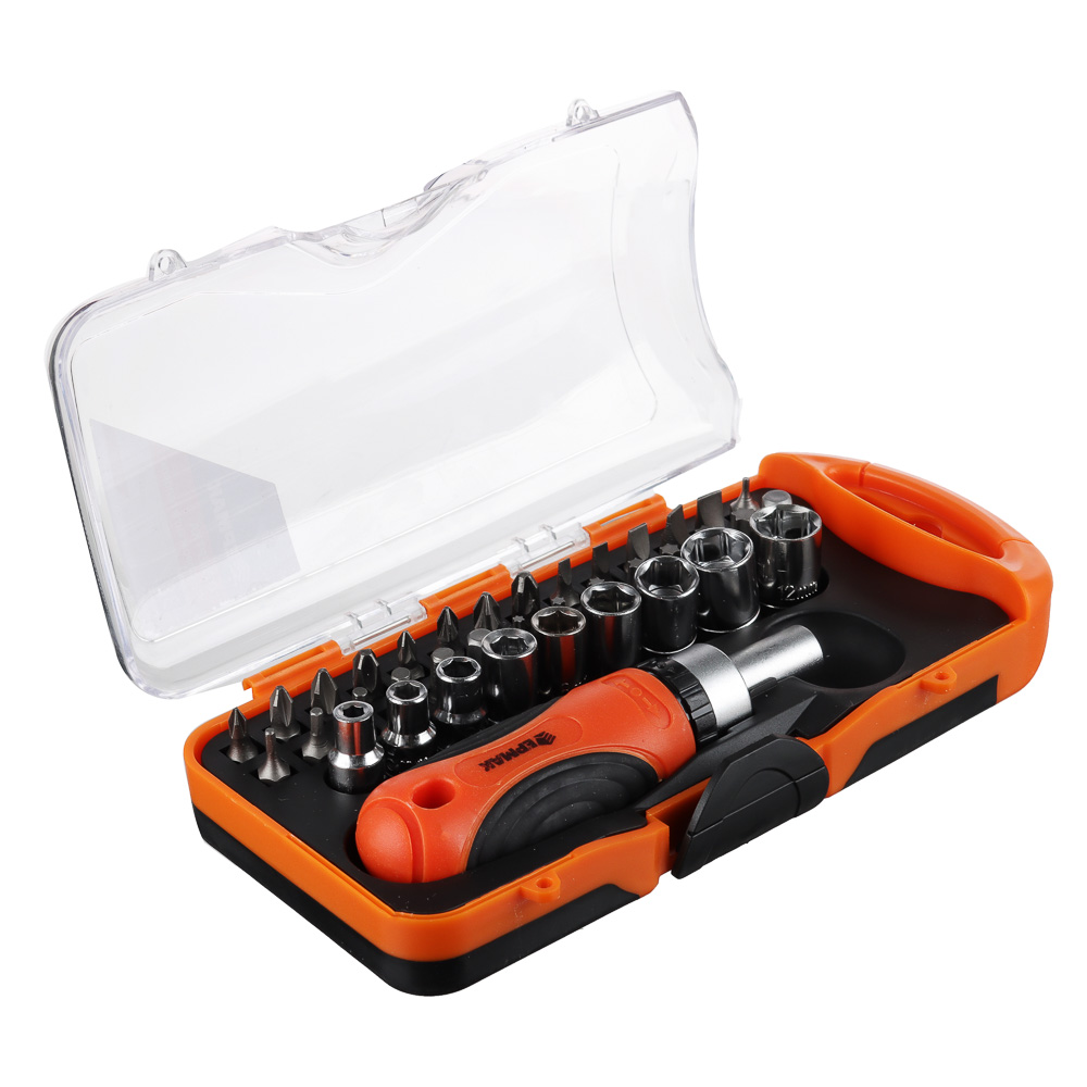 Отвертка ЕРМАК с набором бит и головок – это прибор для профессионального и бытового использования, предназначенный для монтажа и демонтажа резьбовых соединений различных типов. Включает 38 предметов с широким размерным рядом. Отвертка оснащена надежным держателем бит и эргономичной прорезиненной рукояткой. Биты и головки изготовлены и высококачественной износостойкой стали, устойчивой к деформации. Предусмотрен удобный пластиковый кейс с подвесом для хранения и транспортировки.