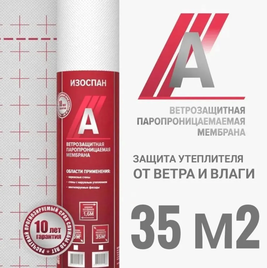 Изоспан A — термоскрепленный полипропиленовый нетканый материал. Ветрозащитная мембрана Изоспан A препятствует конвективному движению воздуха через теплоизоляцию, снижая теплопотери. Изоспан A обладает водоупорностью, достаточной для защиты утеплителя и других внутренних элементов конструкций стен от атмосферных осадков, проникающих под наружную обшивку, при этом является паропроницаемым материалом, поэтому не препятствует выходу водяных паров из утеплителя в вентилируемый зазор. Прочность материала способствует устойчивости к механическим нагрузкам на этапе монтажа и в процессе эксплуатации. Свойства материала Изоспан A позволяют применять его в качестве ветрозащиты в конструкциях каркасных стен, стен с наружным утеплением и вентилируемых фасадов. В конструкциях внутренних стен (межкомнатных перегородок) Изоспан A применяется для предотвращения проникновения частиц волокнистого утеплителя во внутреннее пространство здания. При соблюдении всех требований к монтажу, применение ветрозащитной мембраны Изоспан A позволяет сохранить теплоизоляционные свойства утеплителя и продлить срок службы конструкций.