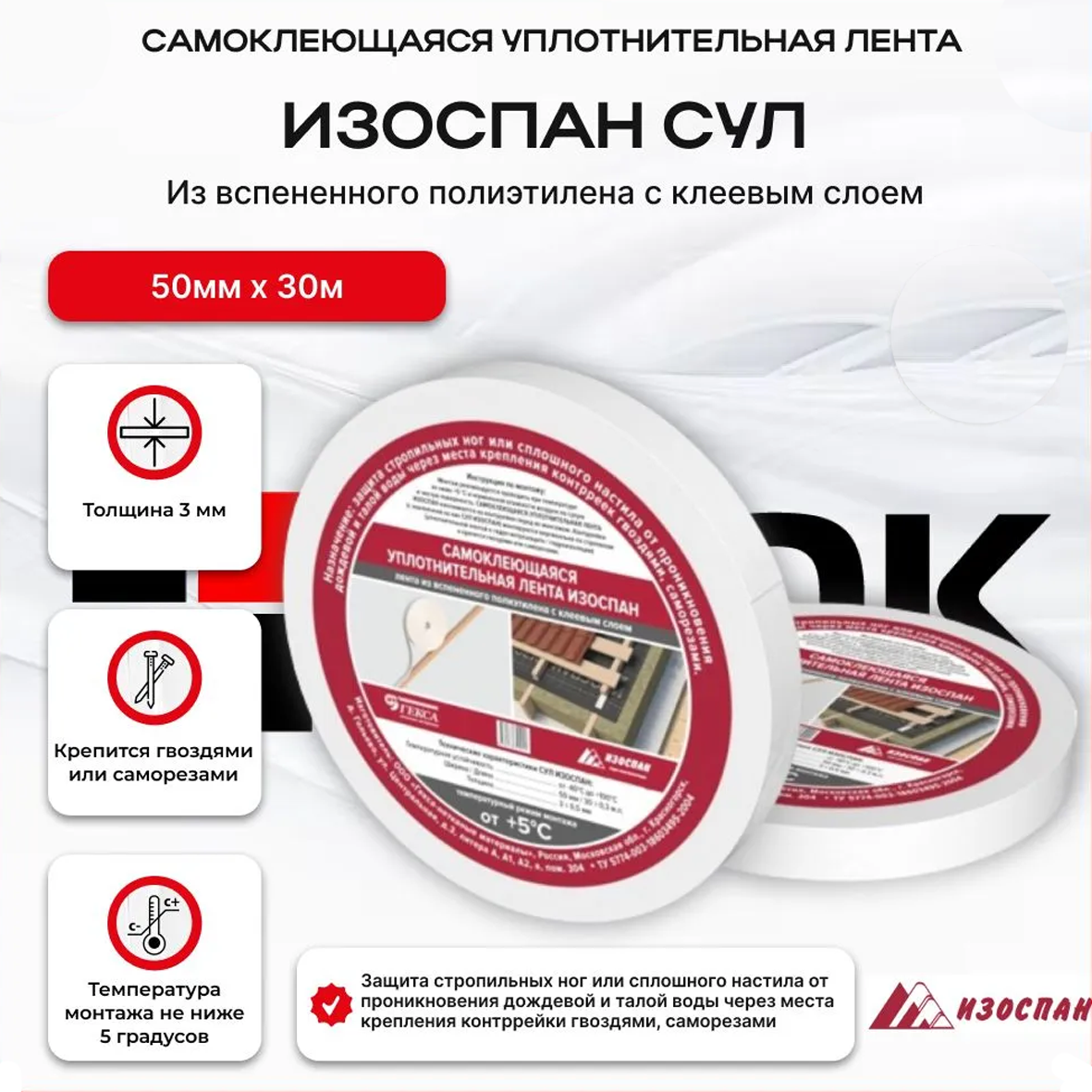 НАЗНАЧЕНИЕ защита стропильных ног или сплошного настила от проникновения дождевой и талой воды через места крепления контррейки гвоздями, саморезами ТЕХНИЧЕСКИЕ ХАРАКТЕРИСТИКИ Толщина 3 мм Температурная устойчивость от −40 °С до +100 °С Температура монтажа не ниже +5 °С