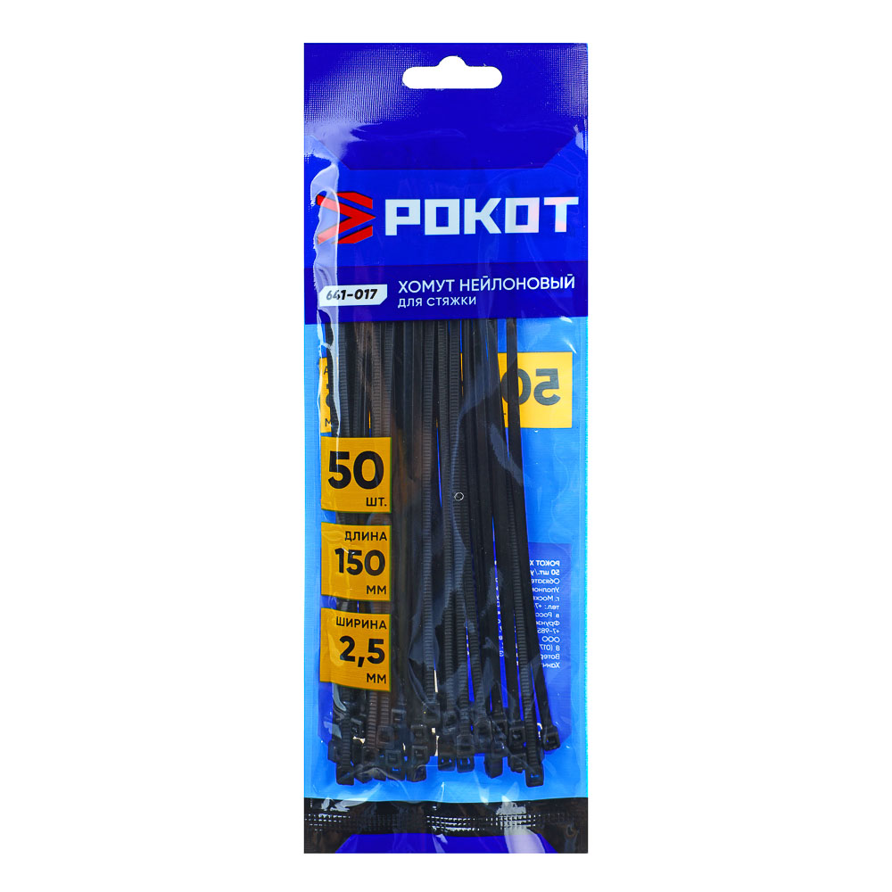 Нейлоновый хомут для стяжки РОКОТ 2,5х150 мм черного цвета имеет широкий спектр применения: используется для крепления и фиксации кабелей и проводов во время прокладки электросетей или в быту, а также могут применяться на участке для подвязки веток и кустарников и везде, где требуется соединить несколько деталей между собой. После фиксации замок не разъединяется, отлично держится. Хомут не теряет своих свойств при температуре от -45°С +80°С. 50 штук в упаковке.